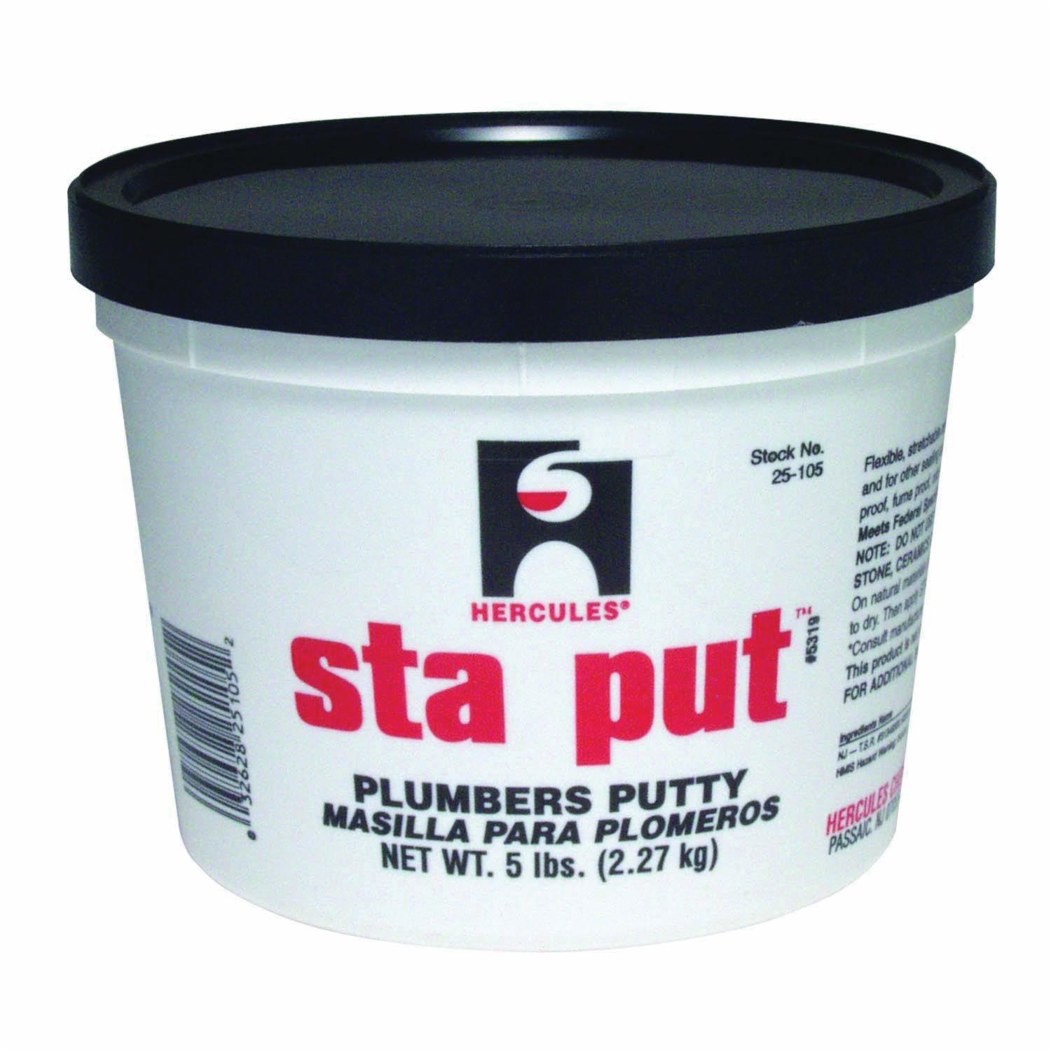 A plumbing sealing and caulking compound for setting plumbing fixtures, bowls, faucets, basin cocks, strainers, plugs, and sink frames. Will not stick to fingers or hands. Always the same smooth, uniform appearance from top to bottom of container with superior sealing qualities. Sta put will not harden, crumble, crack or shrink. It is flexible and stretchable, spreads easily, and can be molded into rings or shaped to the precise configuration needed. It provides a gas proof, fume proof, odor proof, insect proof and watertight seal.