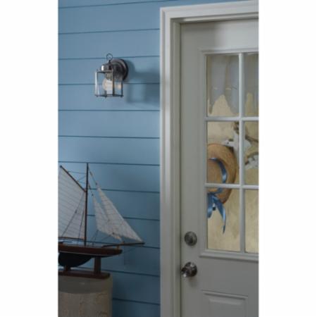 The petite proportions and transitional accents of the New Castle outdoor lighting collection by Sea Gull Lighting make these one-light outdoor wall lanterns a versatile selection for your home. Offered in white, polished brass, antique brushed nickel, antique bronze and black finishes, in either satin etched or clear glass. Clear bulbs are recommended to use for the best aesthetics for the clear glass fixtures. Both incandescent lamping and energy star-qualified LED lamping options are available for those fixtures with the satin etched glass. And the clear glass fixtures can easily convert to LED by purchasing LED replacement lamps sold separately.