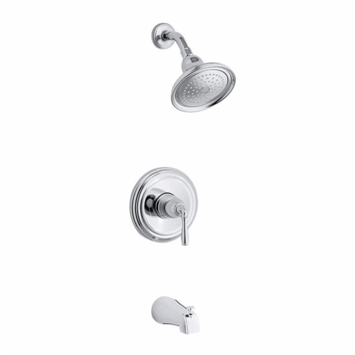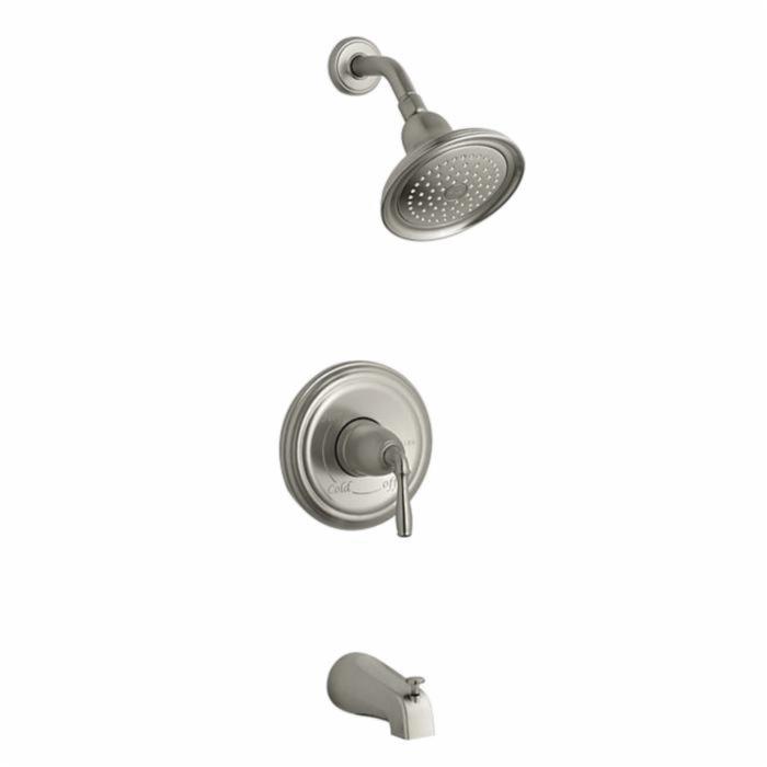 Designed to capture the essence of a bygone era, Devonshire® faucets and accessories bring a versatile, traditional style to the bathroom. This bath and shower trim includes a showerhead with Katalyst® air-induction spray. By infusing 2 L of air per minute, Katalyst® delivers a powerful, voluptuous spray that clings to the body with larger, fuller water drops. Pair this trim with a Rite-Temp® pressure-balancing valve, which maintains your desired water temperature during pressure fluctuations.