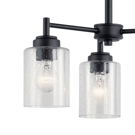 The modern Winslow™ 3-light mini chandelier in a black finish with clear seeded glass shade pair beautifully with the linear arms, bringing light and dimension to a space.